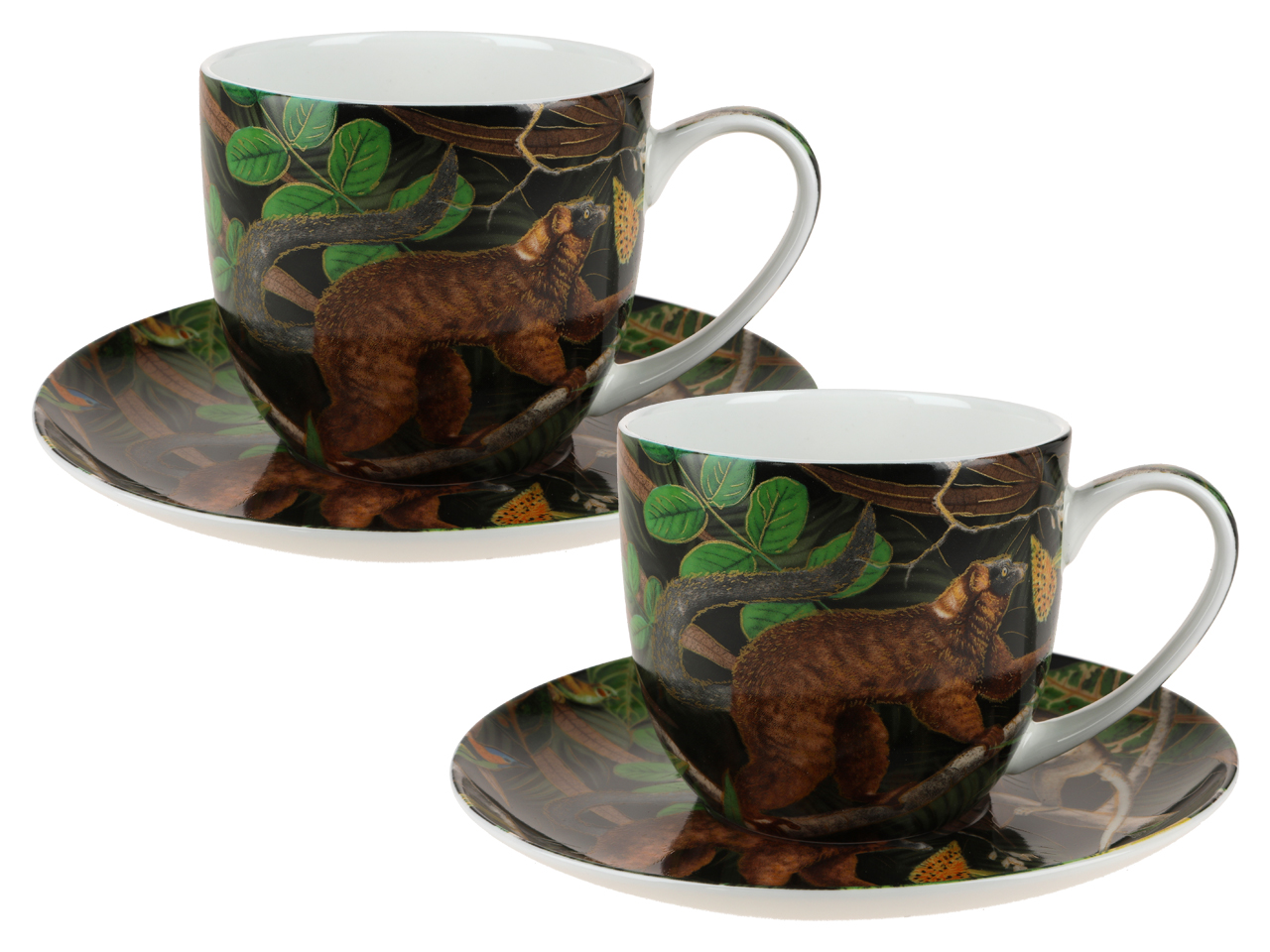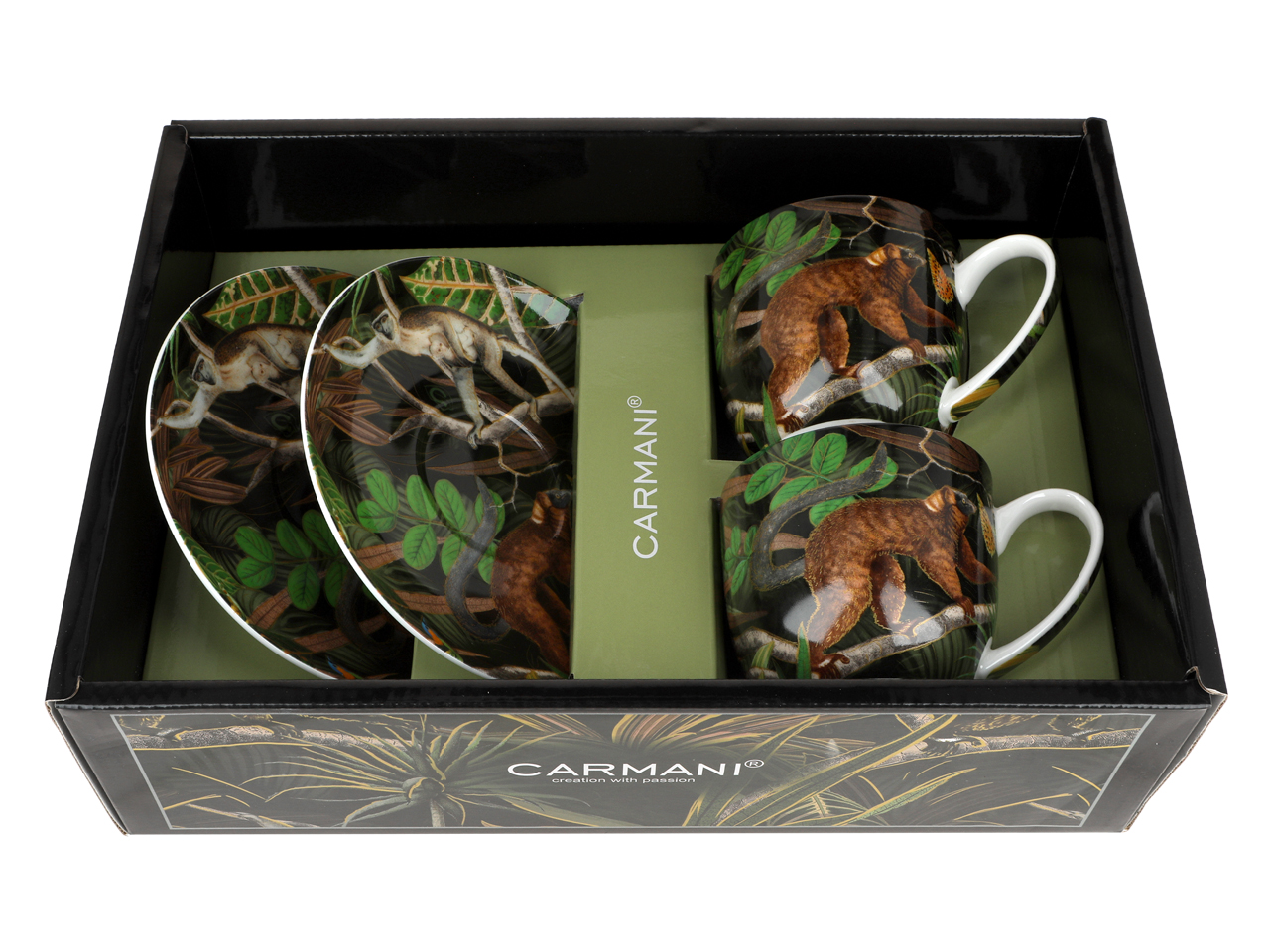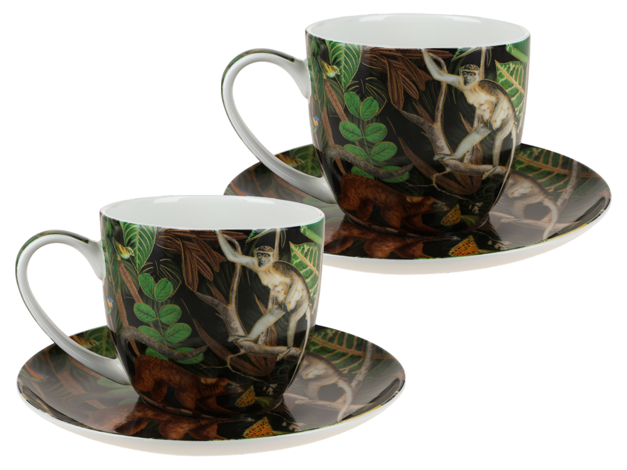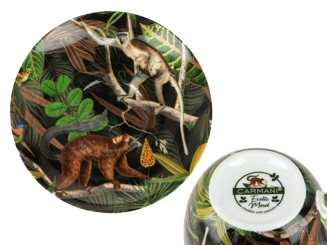 Wysokiej jakości porcelana z motywami dżungli, dominująca kolorystyka to ciemna zieleń i odcienie brązach na czarnym tle.