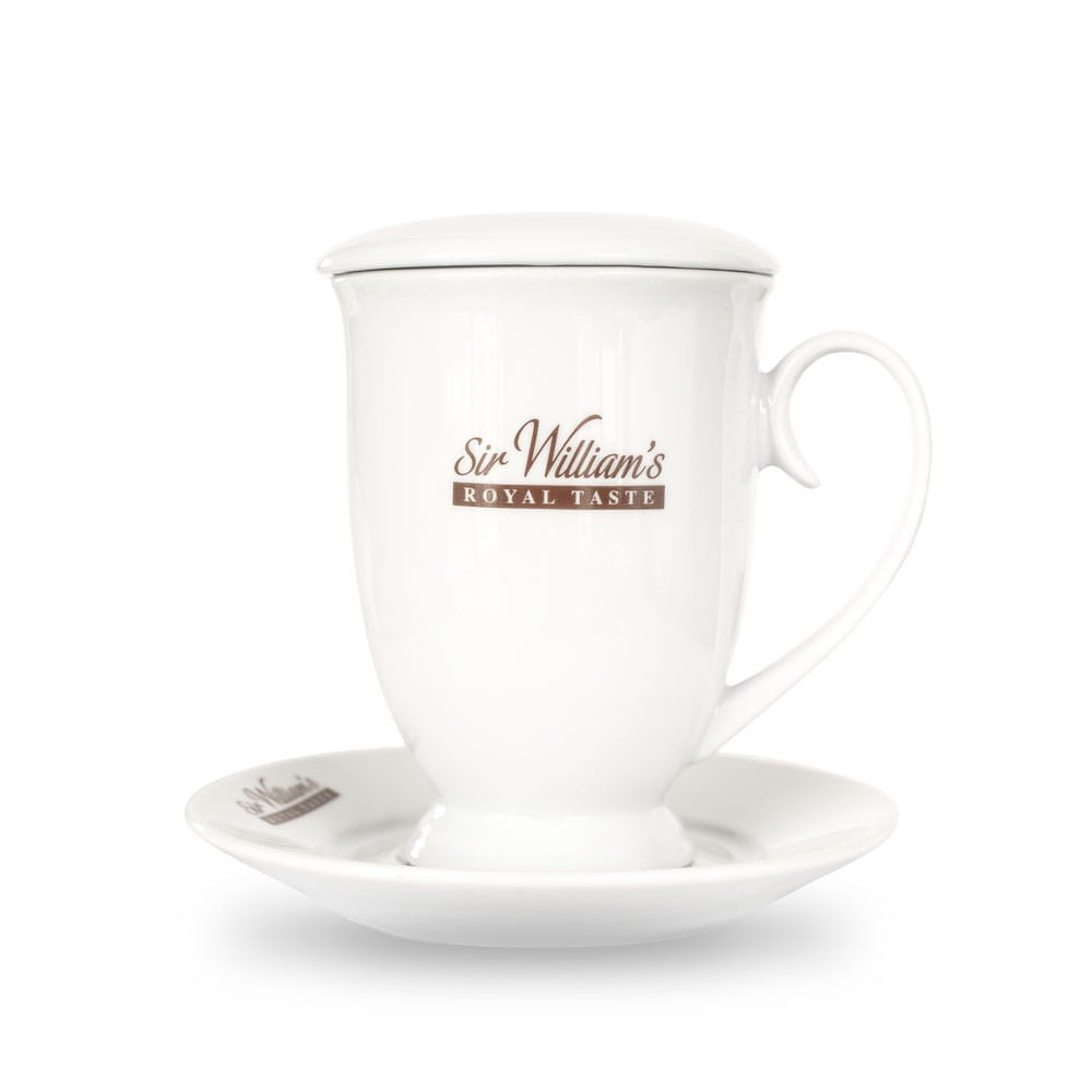 Kubek z logotypem Sir William's Royal Taste do parzenia herbaty Sir William'sa z linii Royal Taste - w dużych saszetkach z talerzykiem i pokrywką.