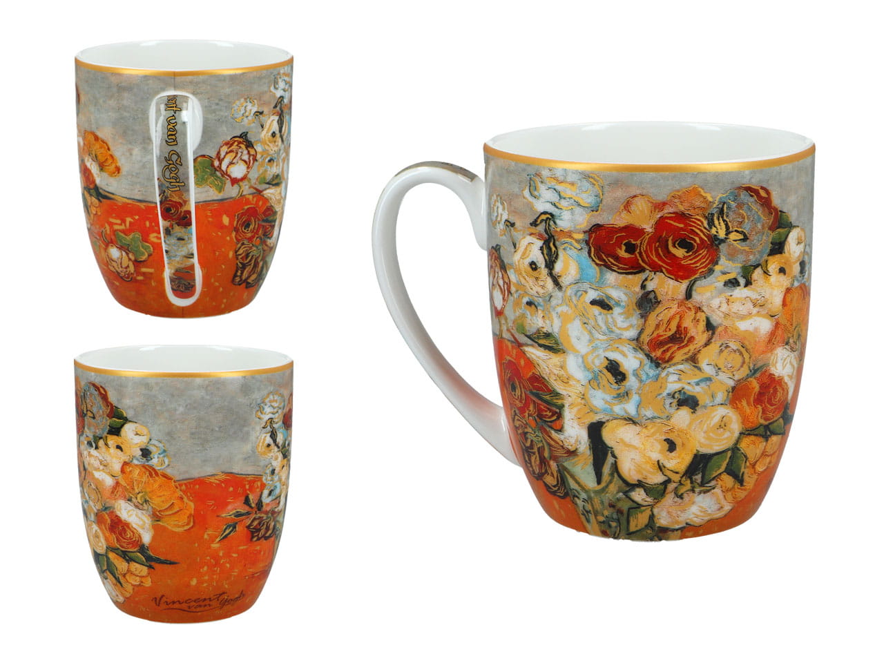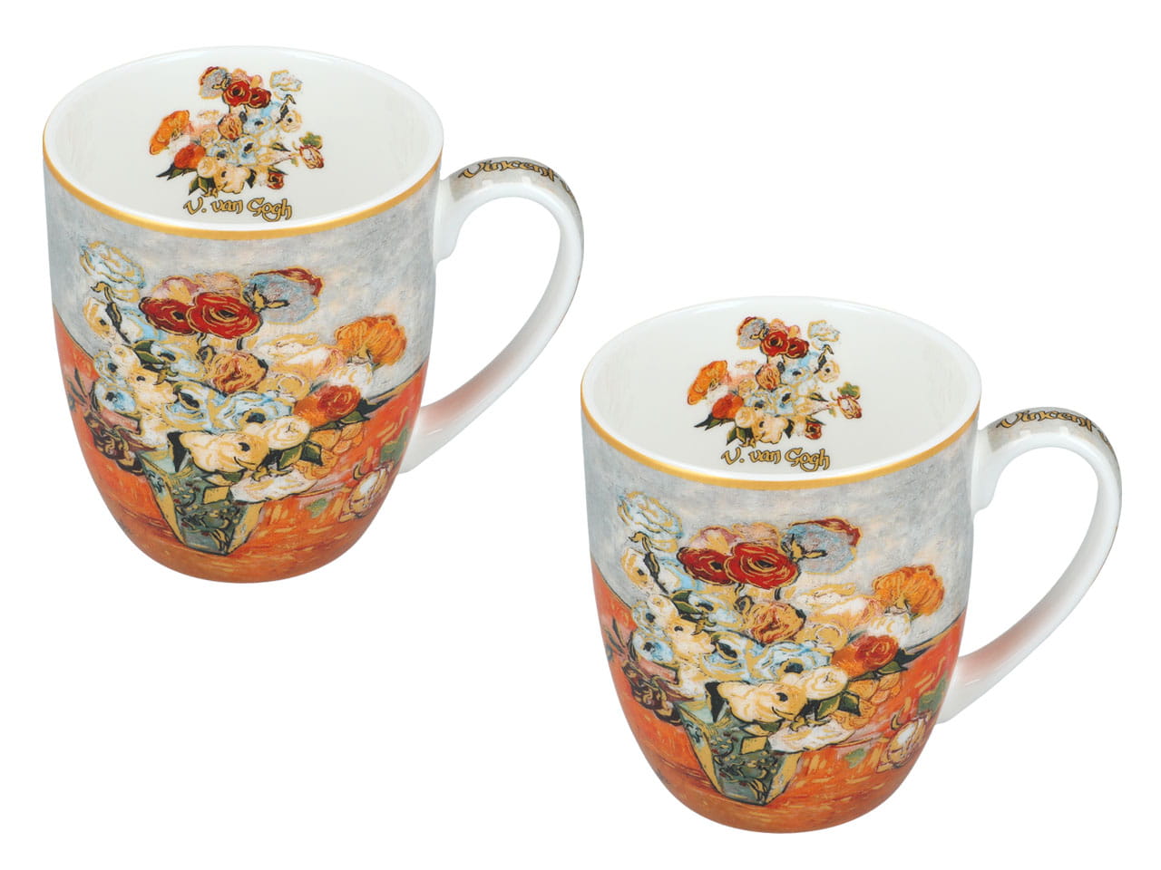 Zestaw 2 kubków o pojemności 400 ml z wysokiej jakości porcelany z motywami z malarstwa Vincenta van Gogha, jednego z najsłynniejszych malarzy europejskich. Na obu kubkach znajdują się motywy z obrazu van Gogha przedstawiającego buket róż i zawilców w wazonie.