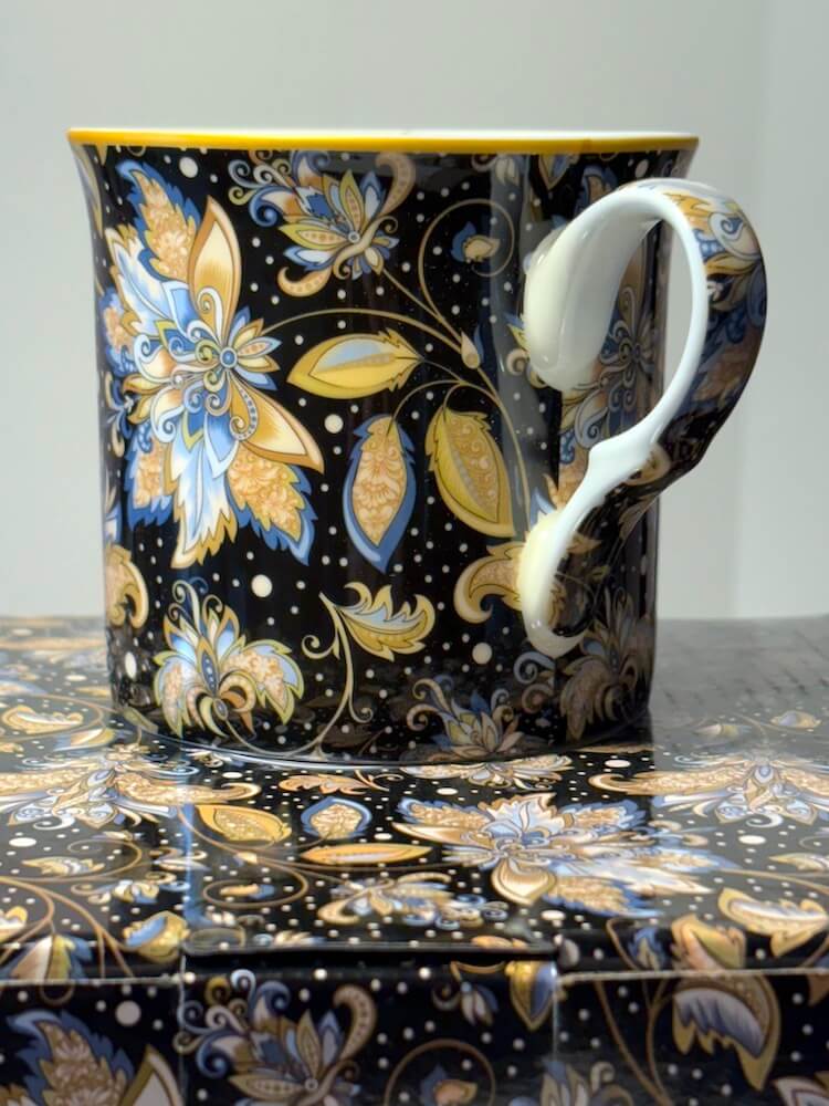 Całkowita pojemność ok. 350 ml (pojemność użytkowa to ponad 300 ml) - kubki doskonale nadają się do codziennego użytku - do herbaty czy dużych kaw z mlekiem. Piękne kwiatowe wzory w odcieniach złota, beżu i kremu, z akcentami jasno- i ciemnoniebieskimi, na czarnym tle, sprawiają, że kubki wyglądają elegancko, ale jednocześnie fantazyjnie i nieco egzotycznie, przy czym nie oddalają się zanadto od typowej dla brytyjskiego wzornictwa kompozycyjej harmonii.
