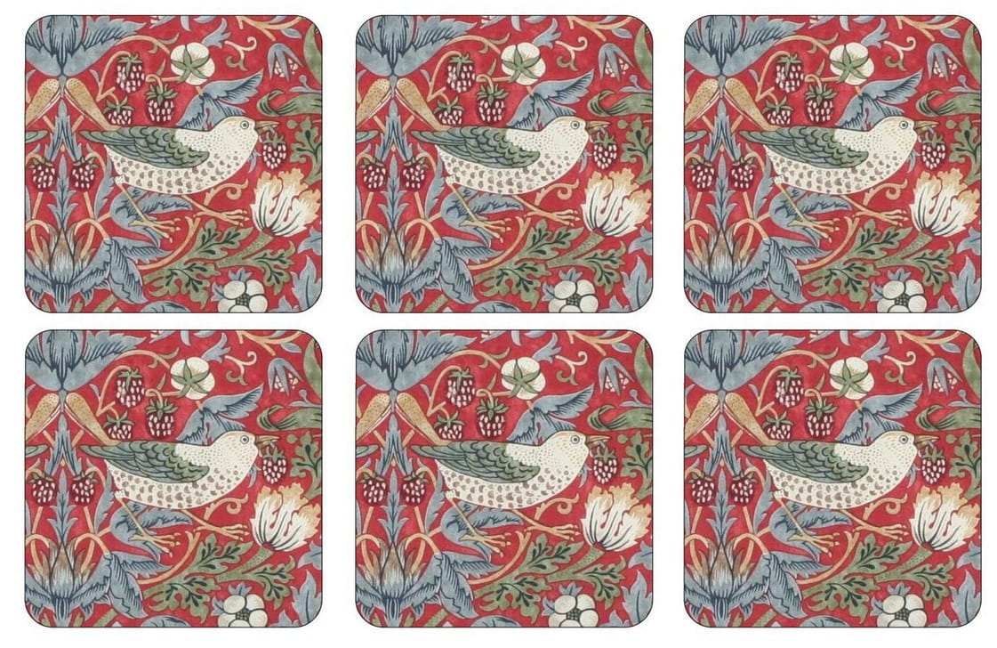 Pimpernel Strawberry Thief Red - komplet 6 podkładek pod kubki 'Złodziej truskawek' wg projektu Williama Morrisa