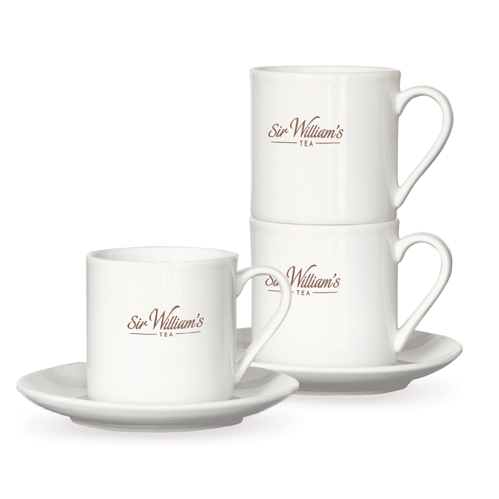 Porcelanowy kubek do parzenia herbaty z logotypem Sir William's Tea z talerzykiem, sztaplowny - czyli do układania piętrowego (jeden na drugim - zajmuje dzięki temu mniej miejsca w szafce)