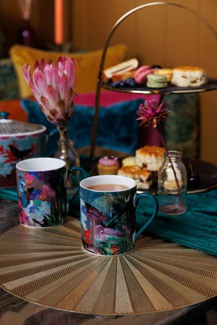 Kubek porcelanowy o poj. 350 ml z kolekcji będącej owocem współpracy marki Mikasa z uznaną artystką Sarah Arnett. Naczynie zdobi niezwykle żywy obraz flaminga, ukazany na misternym tle egzotycznej flory i fauny, co nadaje mu unikalnego, niemal rzeźbiarskiego charakteru. Całość dopełnia elegancki, kontrastujący uchwyt, który podkreśla nowoczesną formę kubka.