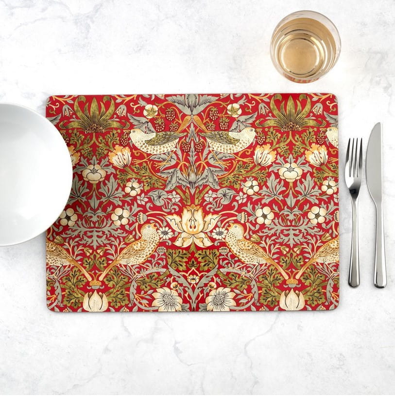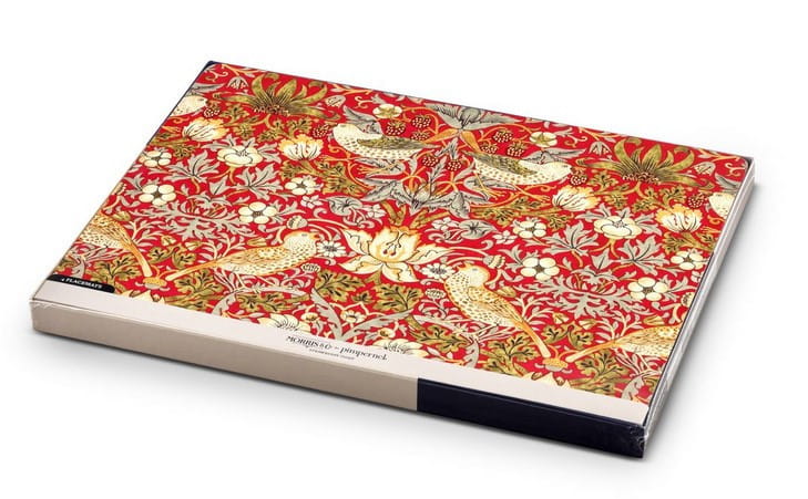 Komplet podkładek "Strawberry Thiel" ('złodziej truskawek') marki Pimpernel to impresja Williama Morrisa, zainspirowana sceną z natury rozgrywająca się w jego ogrodzie w Kelmscott Manor. Jest to jedno z najsłynniejszych przedstawień tego wybitnego angielskiego artysty z ruchu Arts & Craft i jedno z najbardziej rozpoznawalnych wizerunków epoki wiktoriańskiej.