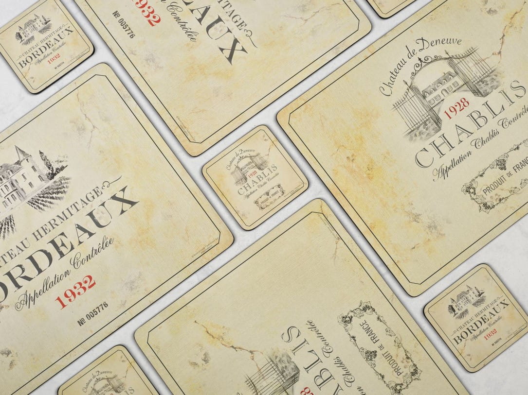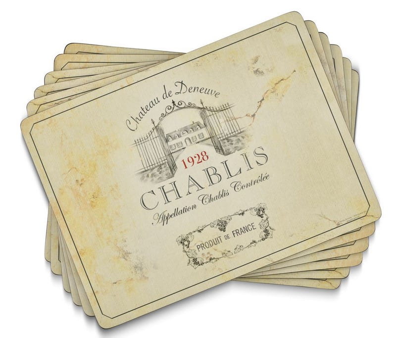 Zestaw 6 eleganckich podkładek stołowych Pimpernel z kolekcji Vin de France to połączenie tradycji brytyjskiego designu i doskonałej funkcjonalności. Podkładki zostały ozdobione motywami etykiet klasycznych francuskich win - Baurdeaux i Chablis. Dawne roczniki (1928 i 1932) i tradycyjne stare etykiety wprowadzają nutę nostalgii za światem, który bezpowrotnie przeminął.
