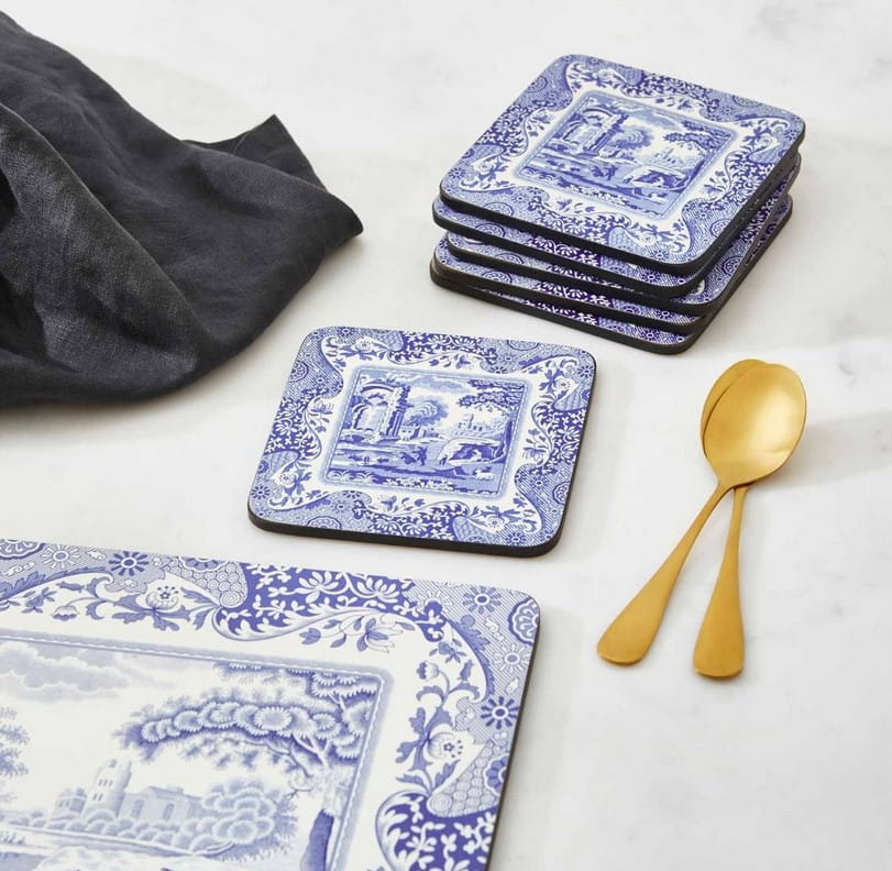 Komplet podkładek Blue Italian marki Pimpernel to zestaw, który wykorzystuje tradycyjny angielski wzór, powstały ponad dwa wieku temu - w roku 1816 - w firmie Spode, jednej z kilku manufaktur, które działają nieprzerwanie do dziś w Stoke-on-Trent, w hrabstwie Staffordshire, w brytyjskim centrum tradycyjnej ceramiki. Wzór, który powstał oczywiście dla celów zdobienia naczyń, był inspirowany japońską ceramiką Imari, w której dominowały kwiatowe ornamenty. Blue Italian przedstawia włoski pejzaż wiejski, typowy dla romantyzmu, z kwiatową bordiurą, w tradycyjnym kolorze dawnej ceramiki europejskiej - głębokim kobalcie (nasycony niebieski o chłodnym tonie) na białem tle.