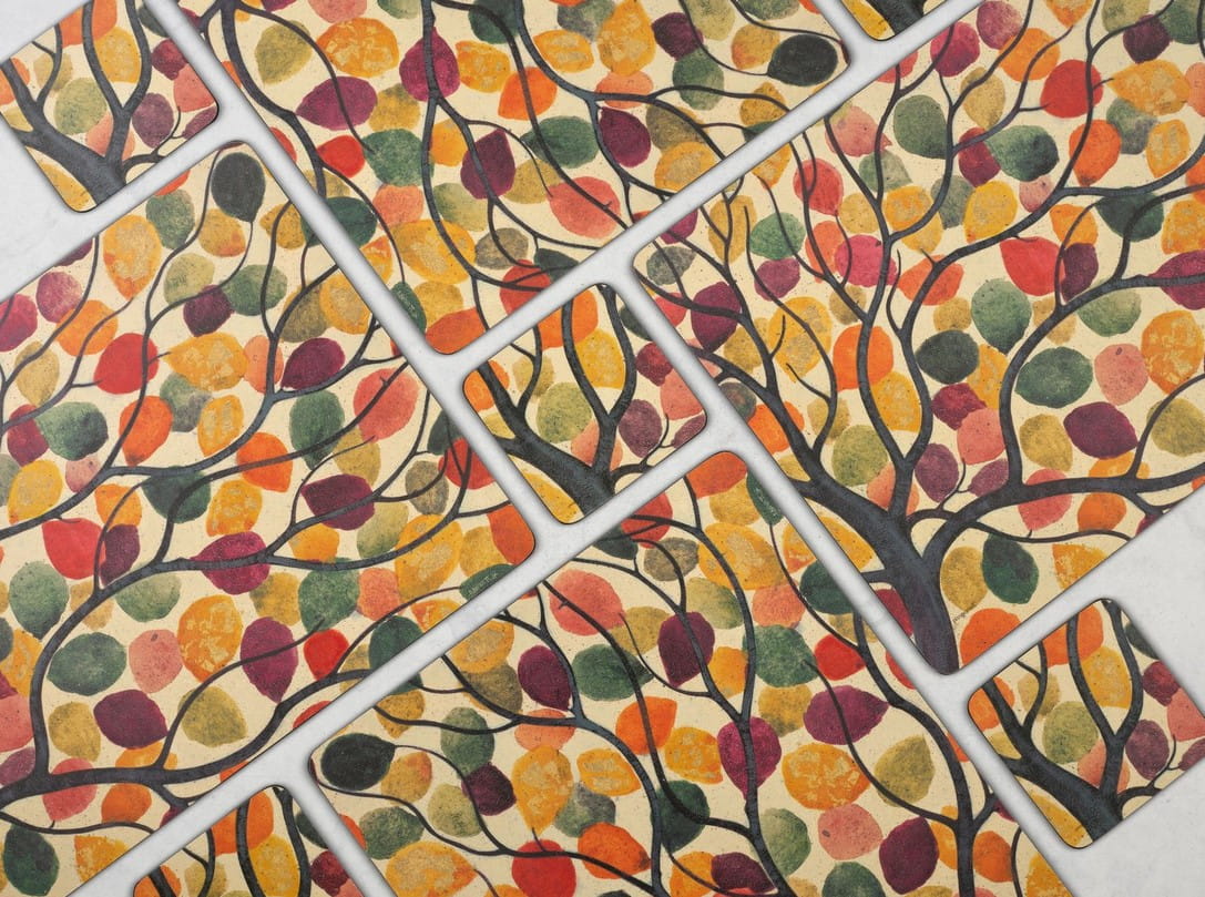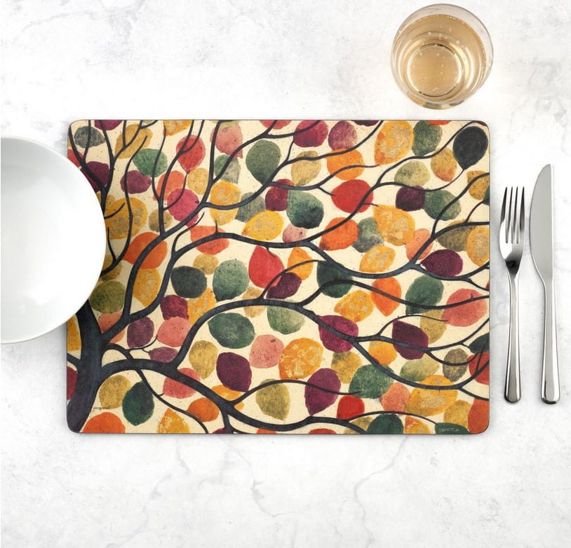 Dancing Branches — stylizowane, „tańczące” gałązki i liście w ciepłej, jesiennej palecie barw to współczesna interpretacja natury - ale utrzymana w tradycji XIX-wiecznego rzemiosła brytyjskiego z kręgu ruchu Arts & Craft. Wzór stworzony w Stoke-on-Trent - w pracowni projektowej grupy Portmeirion, w skład której wchodzi m.in. marka Pimpernel - wyraźnie nawiązuje do uproszczonej ornamentyki roślinnej, bliskiej Willamowi Morrisowi i ruchowi Art & Craft. Paleta barw oscyluje tu wokół kości słoniowej, taupe (kolor kreciego futra - szarobrązowy) i grafitu, z akcentami mocniejszych i ciepłych barw jesiennych, wprowadzając spokojny klimat i - dzięki nieco "bajkowej" grafice - pogodny nastrój.
