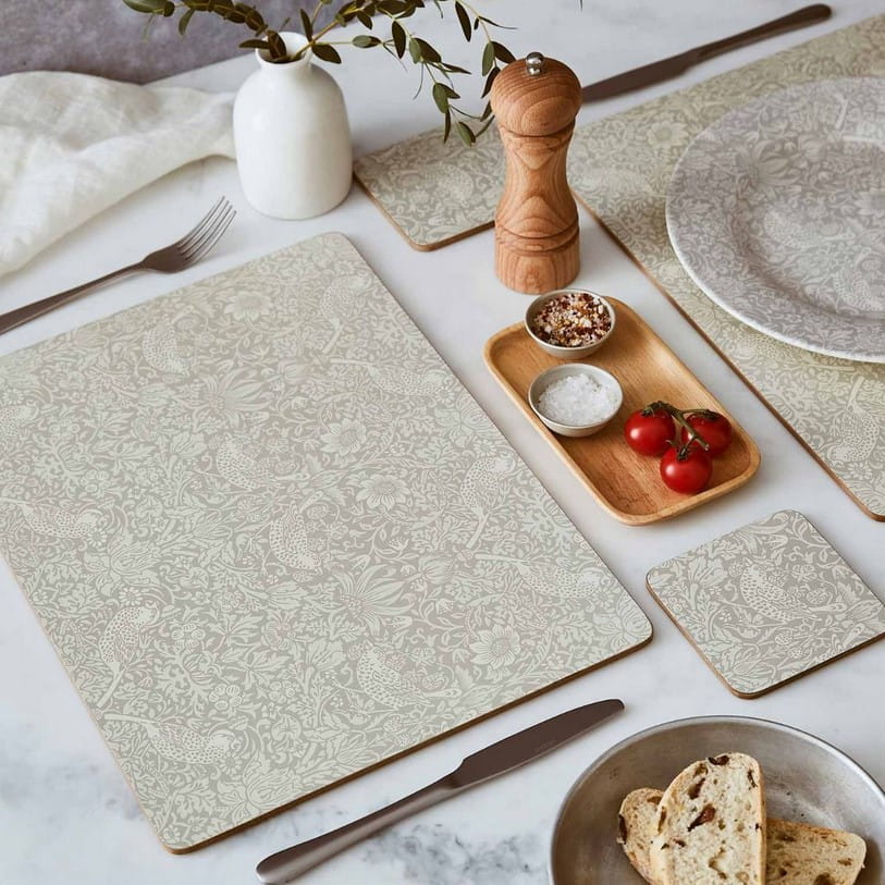 Zestaw 4 prostokątnych podkładek stołowych marki Pimpernel to propozycja łącząca walory użytkowe z subtelną estetyką brytyjskiego wzornictwa. Produkt zdobi motyw Strawberry Thief (Złodziej Truskawek), jeden z najbardziej ikonicznych projektów Williama Morrisa, stworzony pierwotnie w 1883 roku. Wersja Pure Morris charakteryzuje się stonowaną, minimalistyczną kolorystyką, która nadaje klasycznej kompozycji nowoczesnego, eleganckiego sznytu. Wzór ten przedstawia drozdy podjadające owoce w ogrodzie artysty, co Morris ujął w misterną, symetryczną strukturę liści i kwiatów. Podkładki o wymiarach 40 x 30 cm wykonano w zaawansowanej technologii warstwowej: wierzch stanowi dekoracyjny nadruk zabezpieczony trwałym lakierem, rdzeń to sztywna płyta MDF, a spód wykończono naturalnym korkiem. Dzięki temu akcesoria skutecznie chronią blat przed zarysowaniami oraz wysoką temperaturą (do ok. 100°C). To doskonały wybór na elegancki prezent dla osób ceniących przedmioty z duszą, które wnoszą do jadalni powiew historycznego luksusu w odświeżonym wydaniu.