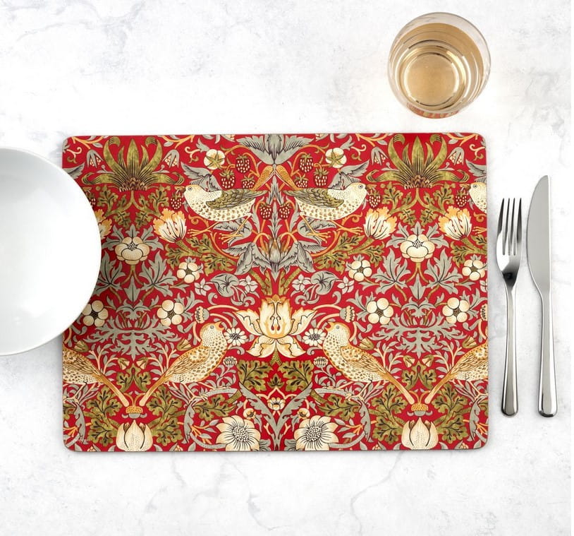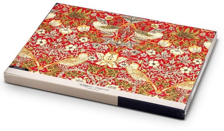 Komplet podkładek "Strawberry Thiel" ('złodziej truskawek') marki Pimpernel to impresja Williama Morrisa, zainspirowana sceną z natury rozgrywająca się w jego ogrodzie w Kelmscott Manor. Jest to jedno z najsłynniejszych przedstawień tego wybitnego angielskiego artysty z ruchu Arts & Craft i jedno z najbardziej rozpoznawalnych wizerunków epoki wiktoriańskiej.