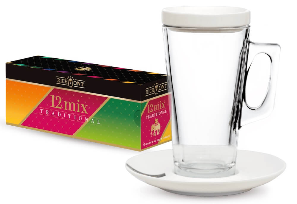 Doskonały zestaw na prezent: 12 dużych saszetek herbaty i komplet ceramiczny Richmont Hot - szklanka 400 ml z podstawkiem i pokrywką