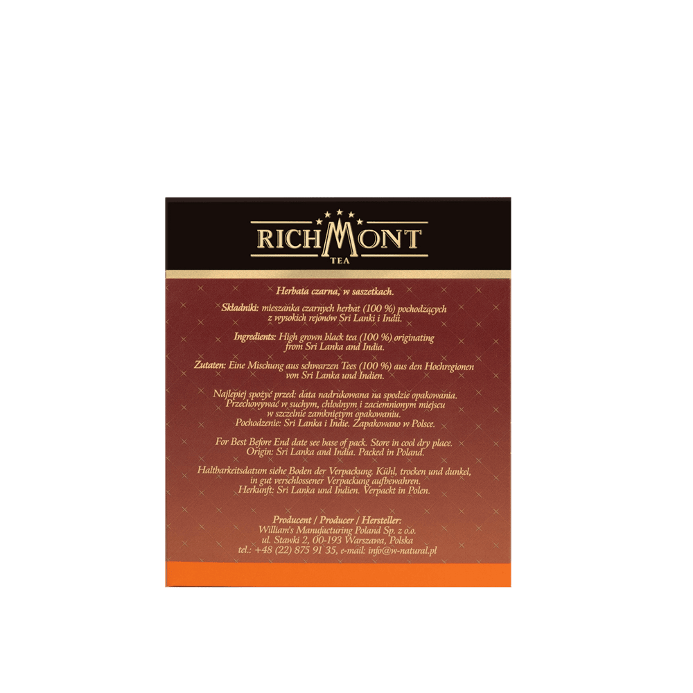 Herbaty Richmont są pakowane w kartoniki po 40 i po 12 saszetek - w osobnych foliowych kopertach, które gwarantują długotrwałe zachowanie świeżości. Herbata jest produkowana z 2-letnim terminem ważności.
