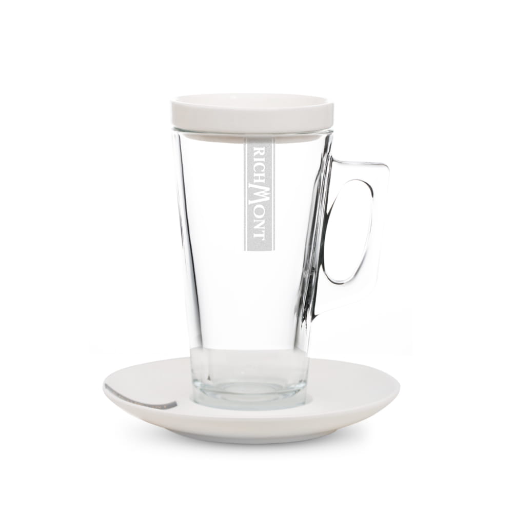 Wysoka elegancka szklanka Richmont Hot z grubego szkła. Duży uchwyt pozwala na bezpieczne i stabilne trzymanie gorącego napoju. Grube szkło zabezpiecza przed łatwym rozbiciem i chroni napój przed szybkim wystudzeniem. W górnej części szklanki znajduje się logo Richmont.