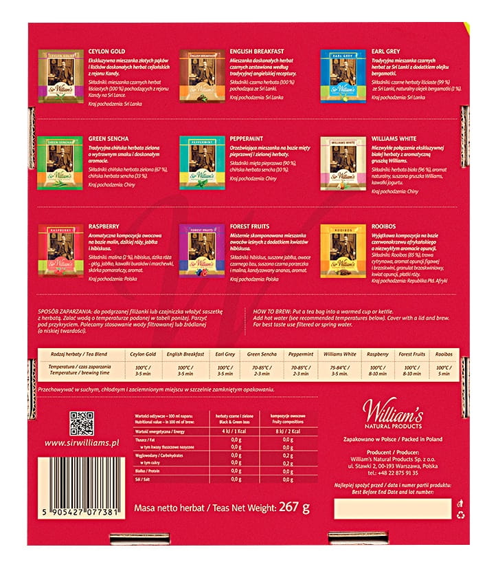 Zestaw zawiera 9 rodzajów herbat po 15 sztuk (komplet herbat serii Sir William's Tea).