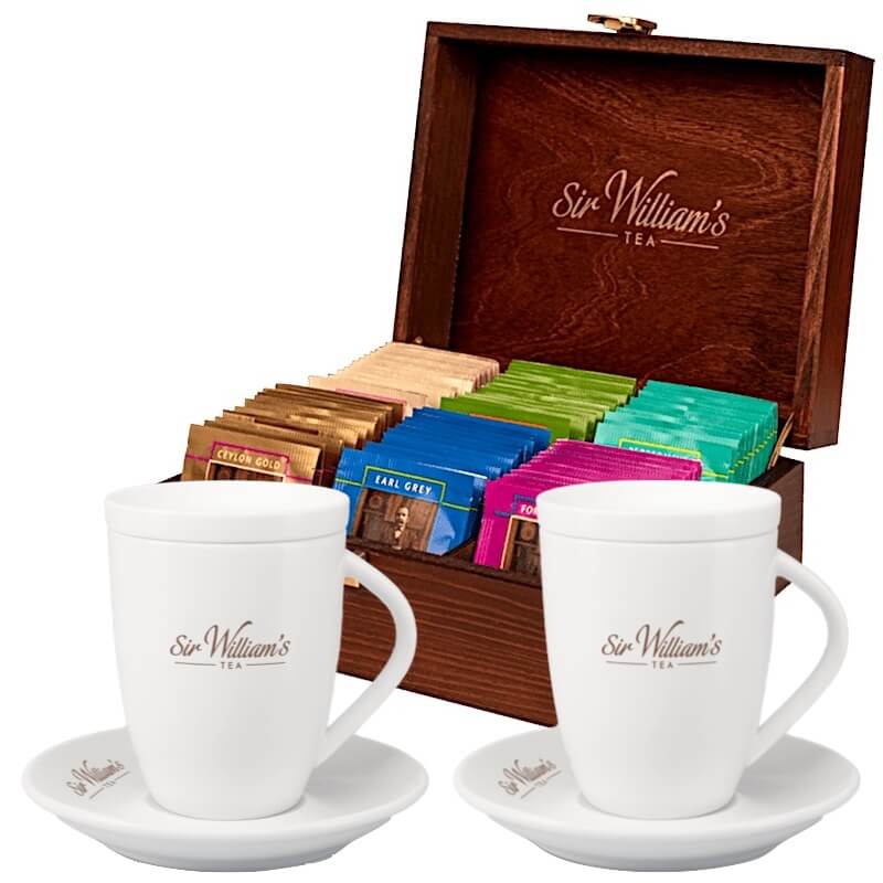 Sir William's Tea 90 herbat w skrzynce i 2 kubki 250 ml ze spodkami i wieczkami