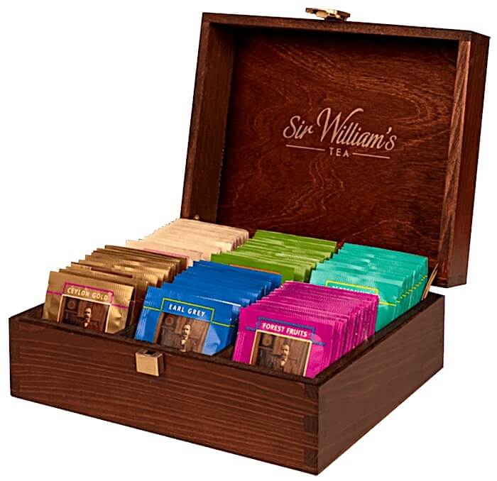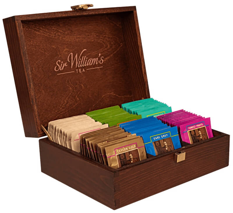 - 90 herbat Sir William's Tea w drewnianej skrzynce, zamykanej na zatrzask, z logotypem marki w środku i na zewnątrz skrzynki,