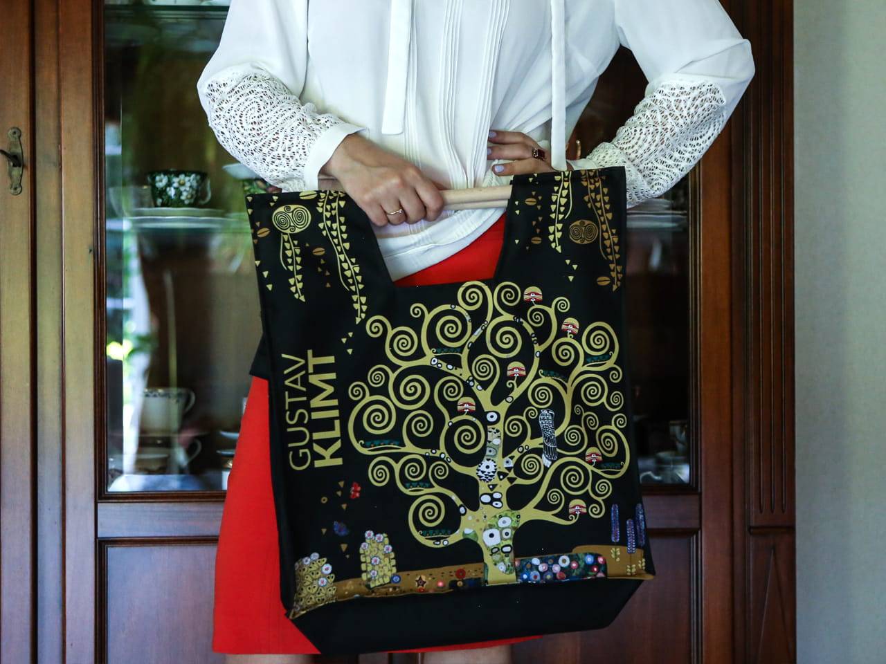 Carmani torba 47x42 cm z drewnianym uchwytem, Klimt - Drzewo życia